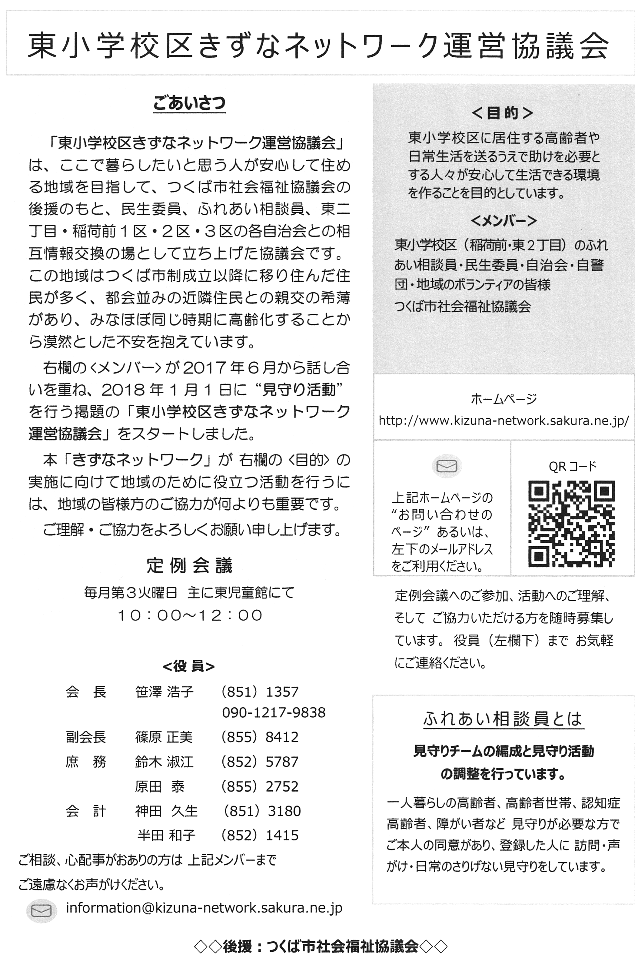 「東小学校区きずなネットワーク運営協議会」は、ここで暮らしたいと思う人が安心して住める地域を目指して、つくば市社会福祉協議会の後援のもと、民生委員、ふれあい相談員、東二丁目・稲荷前1区・2区・3区の各自治会との相互情報交換の場として立ち上げた協議会です。この地域はつくば市制成立以降に移り住んだ住民が多く、都会並みの近隣住民との親交の希薄があり、みなほぼ同じ時期に高齢化することから漠然とした不安を抱えています。
