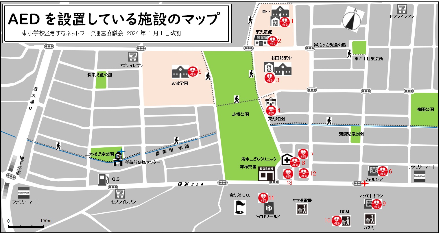 本来AEDの設置目的は、その施設関係者や利用者の救命ですが、近接するエリアでの対応も快諾してしていただきました。このマップを記憶に留めていただけたらと思います。