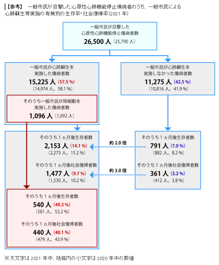 ここから読み取れることは、そこに居合わせた一般市民が心肺蘇生に協力し、除細動が含まれれば、生存率や社会復帰率が飛躍的に高まるということです。